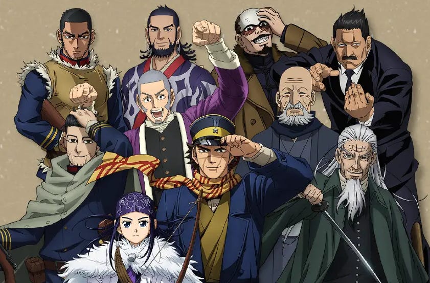Al principio da la sensación de que no arranca (un par de capítulos), pero tranquilo: esta historia de búsqueda del oro con personajes absolutamente estrafalarios termina enganchando de lo lindo. La serie sigue a Saichi “El Inmortal” Sugimoto, un veterano de guerra decidido a encontrar un tesoro de oro Ainu perdido, y a Asirpa, una joven cazadora de la misma tribu que se convierte en su aliada. Juntos se meten en todo tipo de líos mientras esquivan enemigos y descubren secretos del pasado.